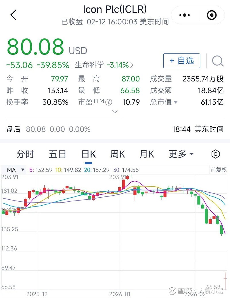 2026年2月13日 08:092026年2月12日,全球第二大合同研究组织(CRO)ICON plc(NASDAQ: ICLR)股价遭遇历史性暴跌,盘中一度重挫逾40%,创下自1999年以来最大单日跌幅。此次暴跌源于公司披露的一项内部会计调查,涉及2023年至2025年期间的营收确认问题,公司因此推迟发布2025年财报并撤回全年业绩指引。