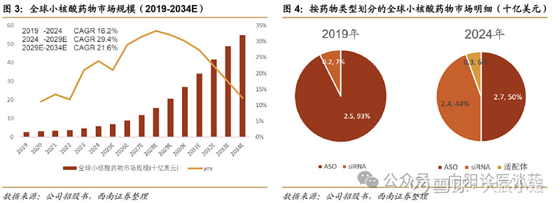 1.1 前瞻布局 siRNA,肝内外递送平台构建护城河小核酸市场星光正盛,siRNA 药物占比近半。全球小核酸药物市场从 2019 年的 27亿美元增长到 2024 年的 57 亿美元,CAGR 16.2%。在技术持续进步、上市批准及临床验证不断增加的推动下,预计全球小核酸药物市场将加速增长,于 2029 年及 2034 年将分别达到 206亿美元及 549 亿美元,2024-2029 年 CAGR 为 29.4%,2029-2034 年 CAGR 为 21.6%。siRNA药物占比由 2019 年约 7%增长至 2024 年的 44%,有望在未来十年占据更大市场份额。