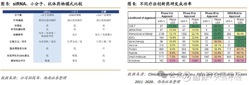 以 siRNA 为代表的小核酸药物兼具长效性与低耐药性,且研发成功率相对较高、研发平台优势明显。
