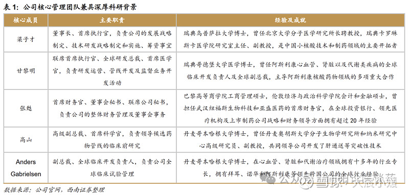 涵盖核酸研发与转化全流程的高技术研发与管理团队。公司董事长、首席执行官梁子才博士曾任北京大学分子医学研究所长聘教授,瑞典卡罗琳斯卡医学院研究室主任、副教授,深耕小核酸研究领域 20 余年,曾牵头国家高技术发展计划下的中国首个重大 siRNA 研究项目,为多个国家级研究计划做出贡献。联席首席执行官、全球研发总裁、首席医学官甘黎明博士曾任阿斯利康心血管、肾脏以及代谢类疾病的全球临床开发负责人及全球副总裁,主导阿斯利康核酸药物领域的多项重大合作,拥有阿斯利康 20 年的研发、运营及管理背景。此外,公司还拥有来自中国、美国、瑞典、法国、荷兰的七位心血管、肝脏和肾脏疾病领域的世界级专家组成的强大的科学顾问委员会。