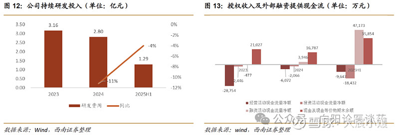 公司持续研发投入,授权收入及外部融资提供现金流。2023 年至 2024 年,研发费用分别为 31,576 万元、28,037 万元,2025H1 研发费用 12,914 万元,同比-4%。现金流方面,目前主要依赖外部融资及授权收入提供现金流,2025 年上半年融资活动现金流净流入 4.72 亿元。