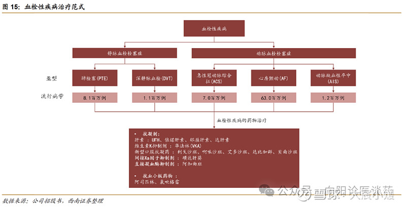 血栓性疾病已成为全球主要死亡原因之一,全球每年约 1/4 的人死于血栓栓塞引发的疾病。血栓形成是血管内限制血液流动的血凝块,主要包括 1)静脉血栓栓塞症(VTE):肺血栓栓塞症(PTE)和深静脉血栓形成(DVT);2)动脉血栓栓塞性疾病:包括急性冠状动脉综合征(ACS)、房颤、动脉缺血发作、脑卒中等。2024 年全球血栓性疾病的发病人数为 2670万人(欧盟 480 万人/中国 700 万人);预计 2034 年将达到 2910 万人(欧盟 760 万人/中国1240 万人)。