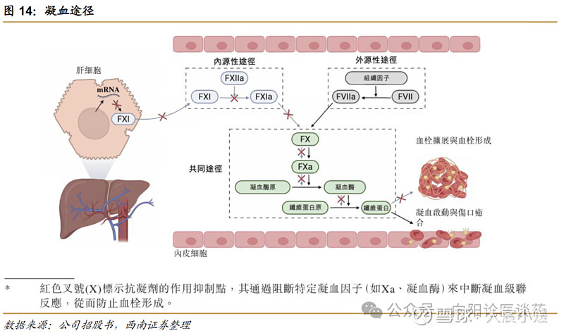 FXI因子仅位于内源性凝血通路上游,抑制FXI有望在抗凝血同时降低出血风险。FXI是一种在血液凝固或止血过程中起关键作用的蛋白质。靶向FXI疗法通过选择性靶向上游的内源性通路,保留正常止血所必需的外源性途径,能够在实现有效血栓预防的同时降低出血风险,相对现有抗凝剂具有关键优势:目前的抗凝剂以凝血酶或Xa因子等下游因子为靶点,会同时影响内源性与外源性途径的功能,增加出血风险。