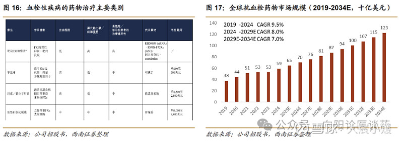 2024 年全球抗血栓药物市场 593 亿美元,其中 55%-60%为靶向 FXI 的 siRNA 疗法的目标市场。目前血栓性疾病的主要药物治疗方案为抗凝剂(包括华法林、肝素、直接口服抗凝剂DOAC)。根据弗若斯特沙利文,全球抗血栓药物市场规模从 2019 年的 376 亿美元增长至2024 年的 593 亿美元,CAGR 为 9.5%,预计 2029/2034 年将达到 874/1226 亿美元,其中约 55%-60%可能成为靶向 FXI 的 siRNA 疗法的目标市场(即需要接受长期慢性抗凝治疗的患者群体)。