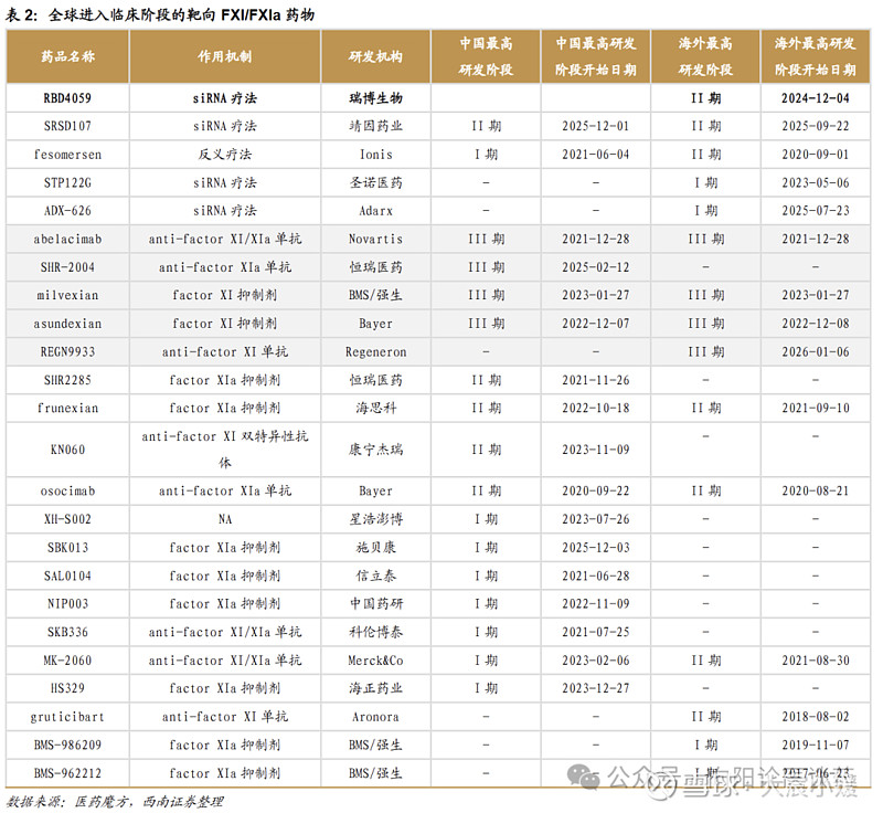 目前尚无靶向 FXI 疗法获批,小核酸赛道中 RBD4059 进度领先。FXI/FXIa 抑制剂按药物形式可分为单抗、小分子、ASO 与 siRNA 四大类。全球范围内共 5 款靶向 FXI/FXIa 创新药进入 3 期临床,包括诺华/Anthos 的 abelacimab(FXI 单抗)、再生元 REGN7508(FXI 单抗)、拜耳 asundexian(FXIa 小分子抑制剂)和 BMS/强生的 milvexian(FXIa 小分子抑制剂)。抑制肝脏 FXI mRNA 表达的小核酸疗法主要包括 Ionis 的 fesomersen (ASO)和瑞博生物 RBD4059,其中 RBD4059 在 FXI-siRNA 中进度最快,目前处于 2 期临床,有望成为全球首款获批用于治疗血栓性疾病的 siRNA 药物。