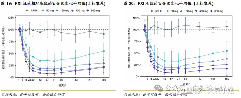 RBD4059 显示广泛的 FXI 抑制水平,可满足各种血栓栓塞适应症可能需要的疗效阈值。在 1 期临床试验中,RBD4059 显示出强劲疗效:50mg、150mg、400mg 及 600mg 队列中,FXI 活性相对于基线的平均最大百分比降幅分别为 67.5%、81.0%、85.8%及 91.6%,药效可持续至试验终点的第 169 天。