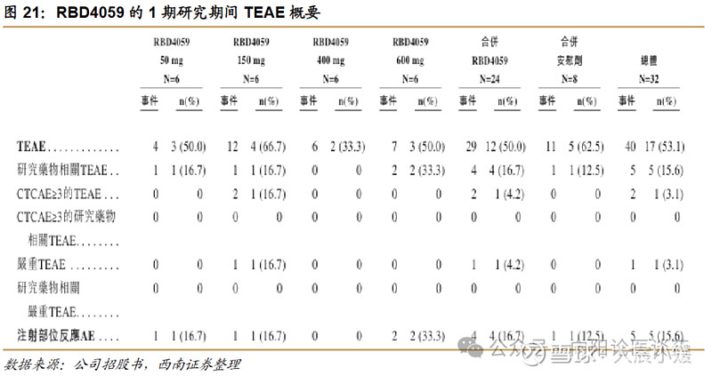 RBD4059 具有良好安全性,相比标准治疗降低出血风险。出血风险是传统抗凝剂的普遍问题。在 RBD4059 的 1 期临床试验中,报告 TEAE 仅为注射部位反应,占比 16.7%;未观察到 Gr≥3 TEAE 或药物相关 SAE。值得注意的是,即使 FXI 抑制水平超过 90%,也未出现出血风险增加的迹象。正在开展的 2a 期试验中,截至数据截止日期(2025 年 8 月 27 日),仅报告 2 例轻度出血事件(1 例痔疮出血、1 例结膜下出血),均未进行特殊医疗干预。