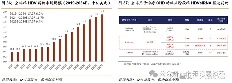 针对 CHB,公司于 2023 年 8 月、10 月分别在瑞典和香港启动 RBD1016 的 2 期试验,目前正在最终完善该试验的数据分析。RBD1016 亦于 2024 年 10 月获得国家药监局 IND 批准,公司计划启动联合治疗试验并纳入中国临床研究中心。针对 CHD,RBD1016 已于 2024年 8 月在瑞典启动IIa 期试验(未单独开展Ib 期),预计于 2026 年底前完成该试验。