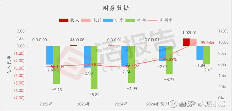 财务业绩公司以18C上市规则上市,并属于未商业化的公司。截至2024年12月31日止3个年度、2024及2025年前9个月:收入分别约为人民币0.01亿、0.09亿、0.01亿、0.01亿、1.02亿;毛利分别约为人民币0.00亿、0.06亿、0.01亿、0.01亿、1.01亿;研发分别约为人民币-2.49亿、-2.90亿、-2.74亿、-2.03亿、-1.84亿;净利分别约为人民币-5.13亿、-5.82亿、-4.99亿、-3.77亿、-2.47亿;毛利率分别约为56.14%、59.81%、55.53%、68.88%、99.68%。