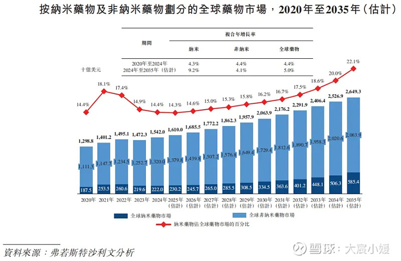 截至2025年9月30日,公司账上现金约8.07亿元,应收账款约0.86亿元,短期贷款0.40亿元。2025年前9月经营现金流约-1.41亿元。行业概况根据弗若斯特沙利文(Frost & Sullivan)的报告,全球纳米技术药物市场呈现稳步增长步伐,由2020年的1,875亿美元增至2024年的2,220亿美元,此期间的复合年增长率为4.3%。展望未来,市场预计将显著加速,至2035年达到5,854亿美元,预计2024年至2035年的复合年增长率为9.2%。