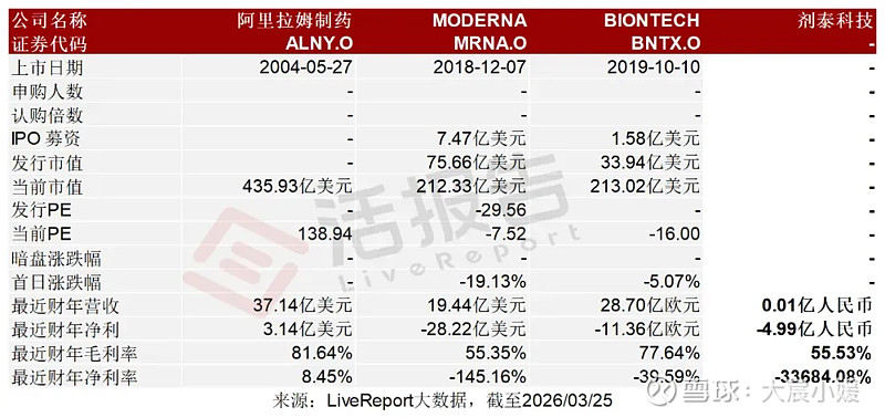 可比公司同行业IPO可比公司:阿里拉姆制药(ALNY.O)、MODERNA(MRNA.O)、BIONTECH(BNTX.O)