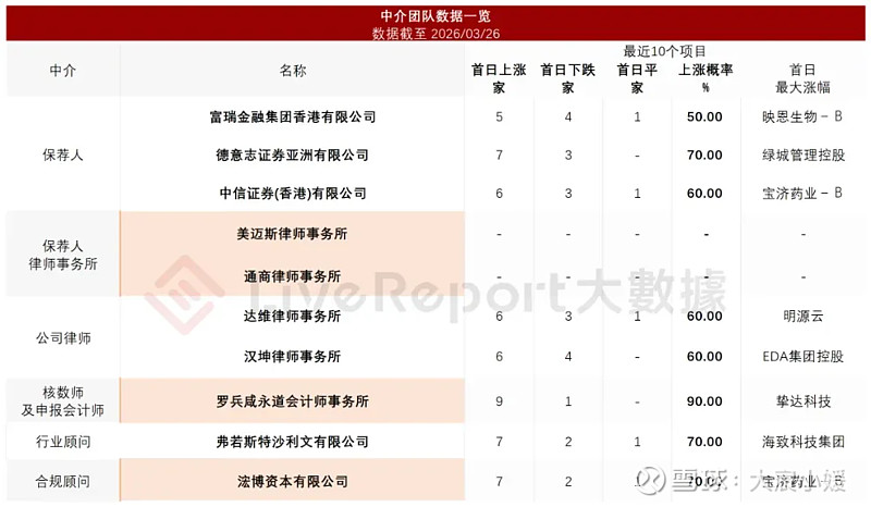中介团队据LiveReport大数据统计,剂泰科技中介团队共计10家,其中保荐人3家,近10家保荐项目数据表现有待提升;公司律师共计2家,综合项目数据表现平平。整体而言中介团队历史数据表现普通。