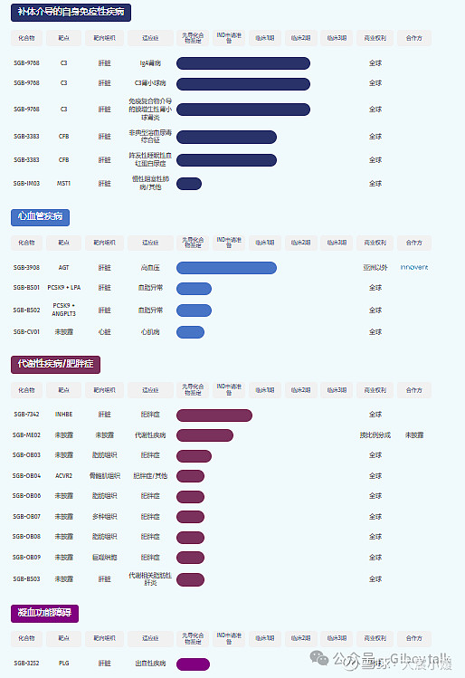 管线布局层面公司目前拥有约17条在研管线,覆盖代谢/肥胖、心血管、自身免疫、罕见病、中枢神经系统(CNS)等多个高价值领域,其中4款已进入临床阶段(1款II期、3款I期),临床推进速度国内领先。核心临床管线包括SGB-9768(靶向补体C3,治疗补体介导疾病,获FDA孤儿药资格)、SGB-3403(靶向PCSK9,降血脂,对标Inclisiran)、SGB-7342(靶向INHBE,减重)、SGB-3908(靶向AGT,高血压,与信达合作),其中多款管线依托LEAD™平台实现肝外递送,具备差异化竞争优势。