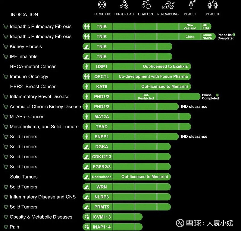 ISM5411(靶点 PHD):针对肠道结构缺陷与异常(代谢/肠道方向),目前到 2A 期,刚完成首例给药。ISM0303(靶点 SHP2):针对实体瘤,目前到二期,未来可能与奥布替尼联用。如果和百济神州、恒瑞这些千亿俱乐部的公司比管线丰富度,英矽智能当然还差得远。但有一个关键区别:这些项目大多数是 AI 原生的——从靶点发现到分子结构设计,全程由 AI 主导,而非仅仅用 AI 辅助优化。