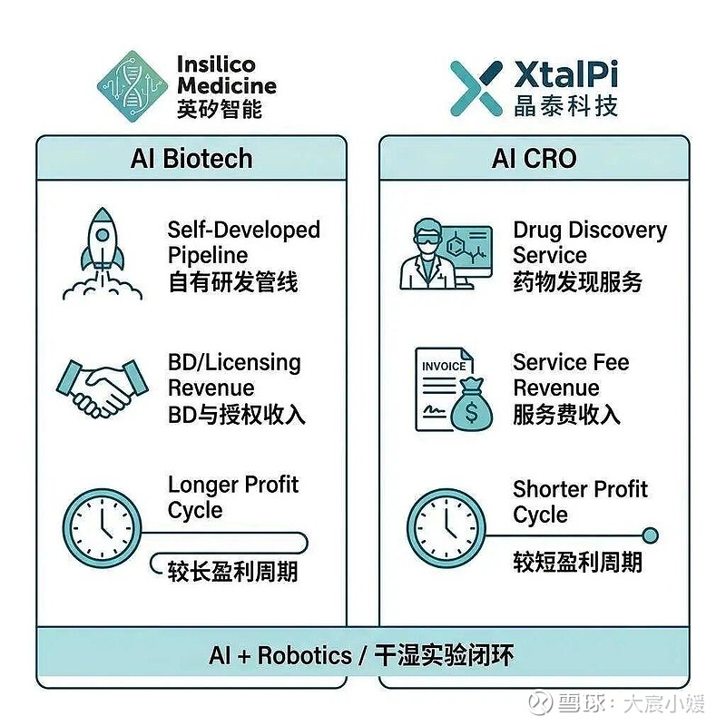 英矽智能 晶泰科技 核心收入 ~90% 来自 BD(管线授权) 主要来自药物发现服务 本质 自研分子,对外售卖 服务药企,收服务费 盈利周期 更长(管线研发 + 授权) 更短(服务费较稳定) 营收稳定性 波动大(BD 具有高度不确定性) 相对稳定一个是"我做药卖给你",一个是"我帮你做药收你钱"。两条路都通,但风险收益的曲线截然不同。