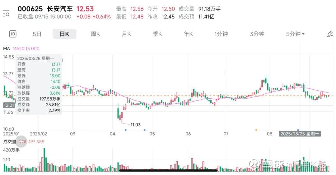 以至于半年报发布后,长安汽车股价遭遇8连跌,市值蒸发超85亿元。直至9月15日,其股价也未能重新站上13元,报收12.53元/股。