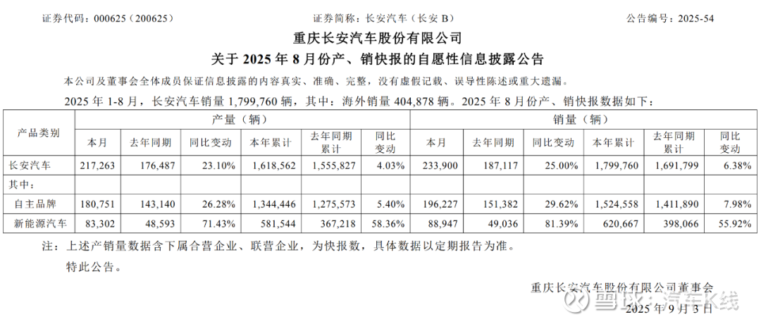 根据长安汽车发布的销量公告可计算得出,今年前8个月,除“自主品牌”外,其余销量为27.52万辆。