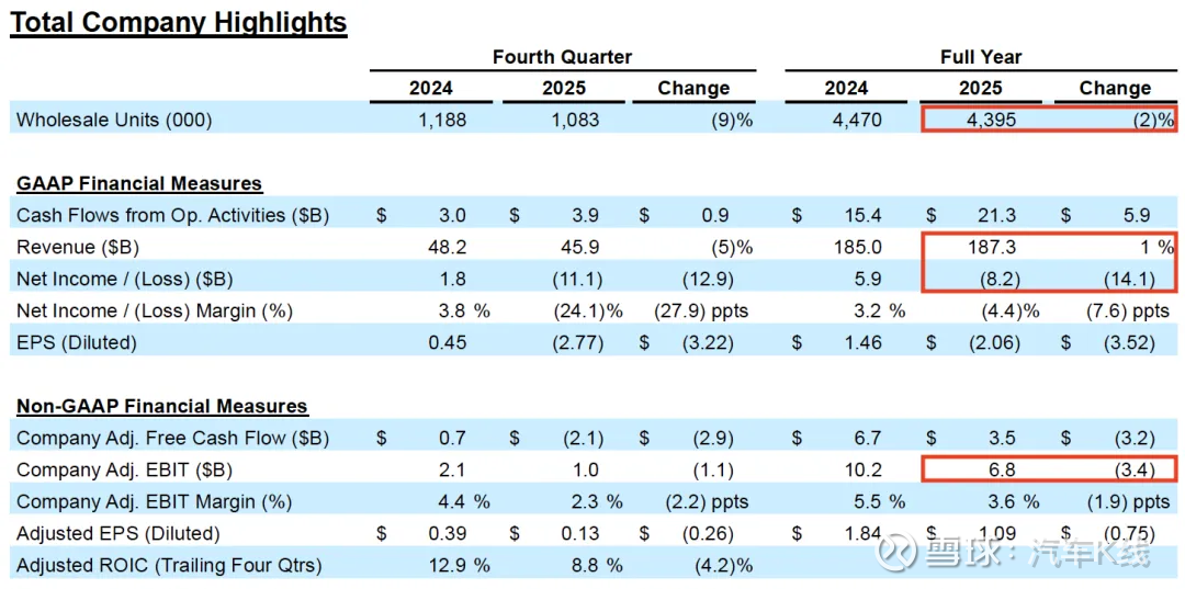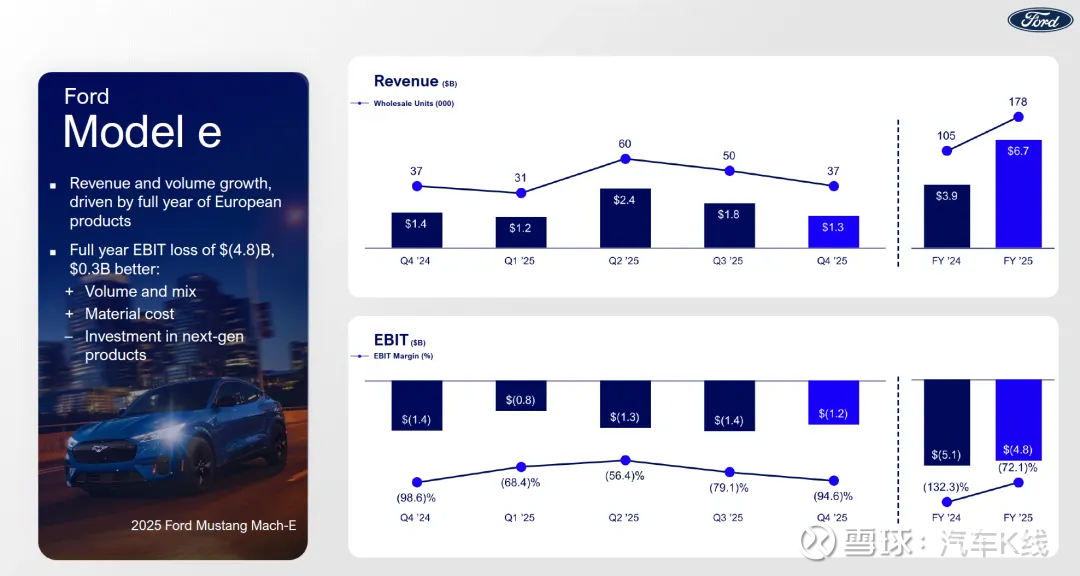 如果没有这笔巨额计提,福特2025年调整后息税前利润为68亿美元,同比下滑33.4%。其中,负责电动化的“Ford Model e”板块全年亏损48亿美元,较2024年略有改善。