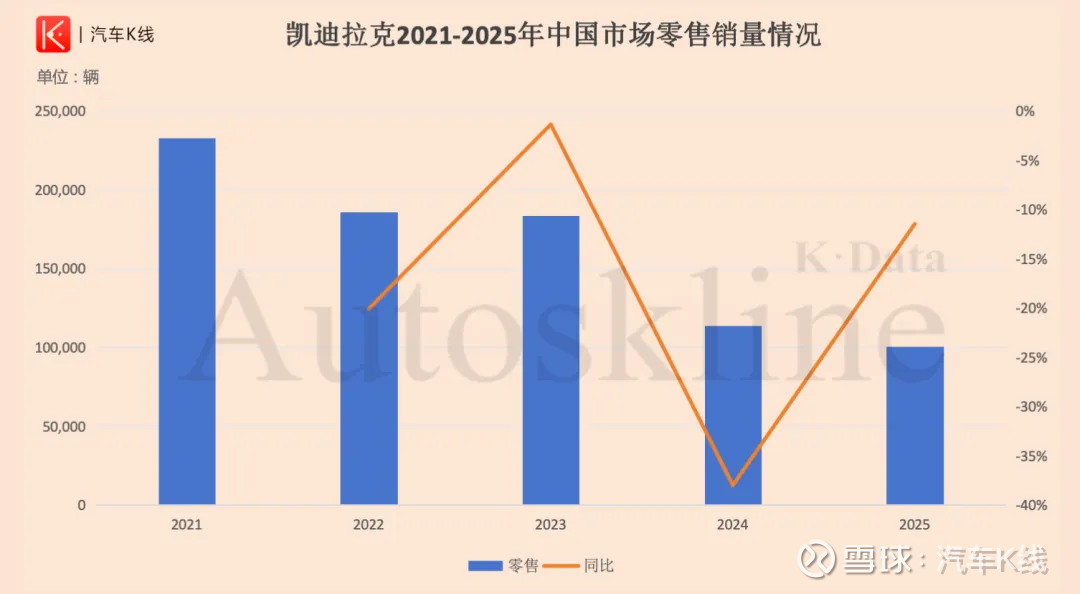 不过值得注意的是,同为美系豪华品牌的凯迪拉克,虽然在2021-2025年间零售销量也从超23万辆滑落至10万辆规模,但其2025年的同比降幅已从2024年逼近40%大幅收窄至11%,呈现企稳迹象。