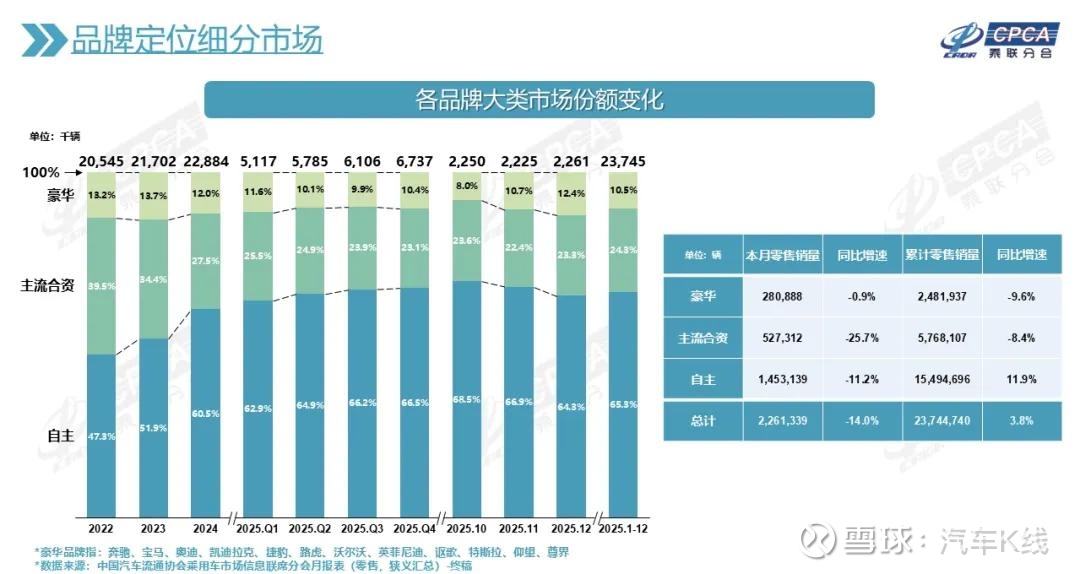 中国汽车流通协会乘联分会统计数据显示,2025年自主品牌市场份额已经扩张至65.3%,豪华品牌则缩减至仅剩10.5%。