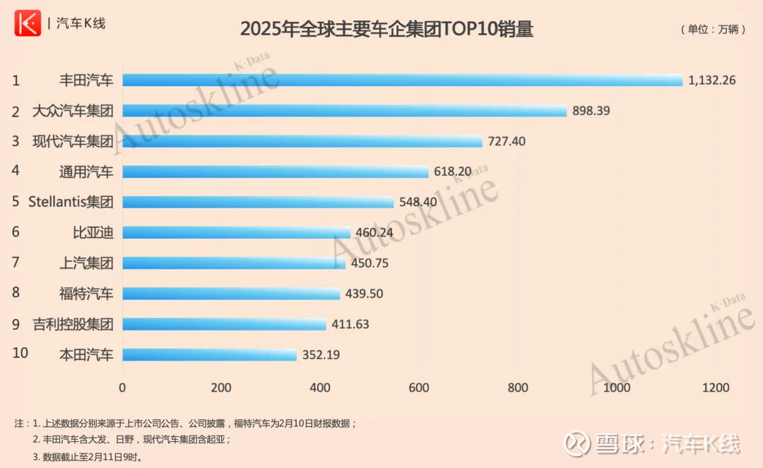 在《汽车K线》整理的2025年全球主要车企集团TOP10销量排名中,通用汽车以618.2万辆位列第4,同比增长3.03%;而福特汽车以439.5万辆排名第8,同比下滑2%,首次被比亚迪超越。