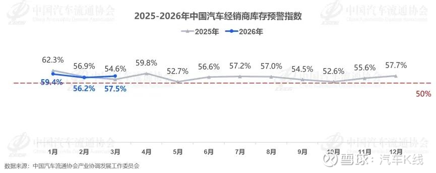 2026年3月,中国汽车经销商库存预警指数为57.5%,不仅环比上升1.3个百分点,更同比高出2.9个百分点,持续在荣枯