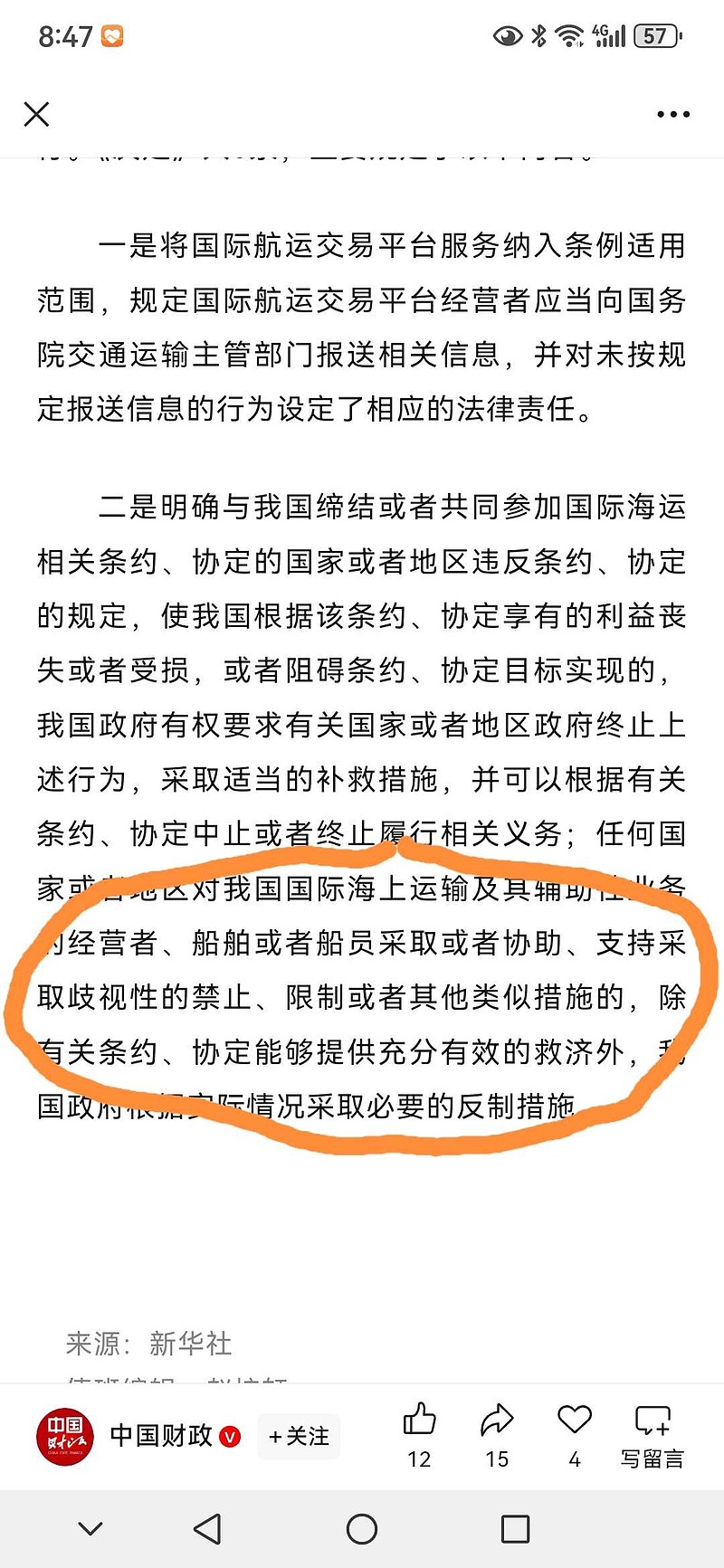 $中远海控(SH601919)$ 海运条例修订,主要是下面这段话,这段话大概有55%以上占比是给海狗定制的!也就是说以前海运条例里没有国家保护意志,现在有了。是不是下次可以和对岸上桌聊这事了?明天能涨多少不知道,应该涨涨,让这几十万股东(除了那二百来个基金和国新)心情愉悦的过个节!