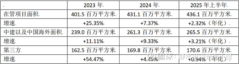 2025年上半年在管面积项目来源中建以及中国海外中建占比达到了60.9%,是目前公司主要的项目来源,通过对于项目在管面积的拆解后,可以明显发现在管面积由双位数增长迅速滑落,甚至出现个位数增长情况