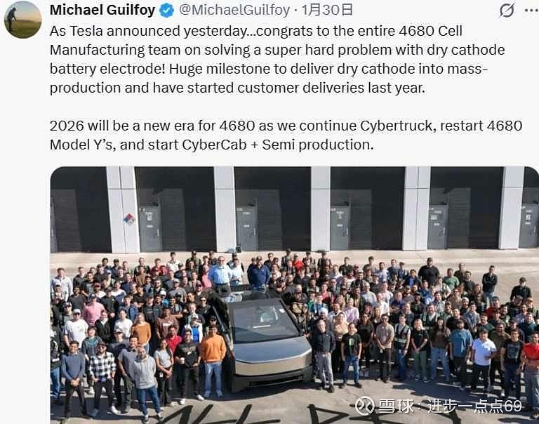 $亿纬锂能(SZ300014)$ @wintercz @爱吃松子 特斯拉昨日官宣:祝贺4680电池电芯制造团队攻克干电极阴极这一超高难度技术难题!实现干电极阴极量产并已于去年启动配套车型的客户交付,这是一座里程碑式的成就。