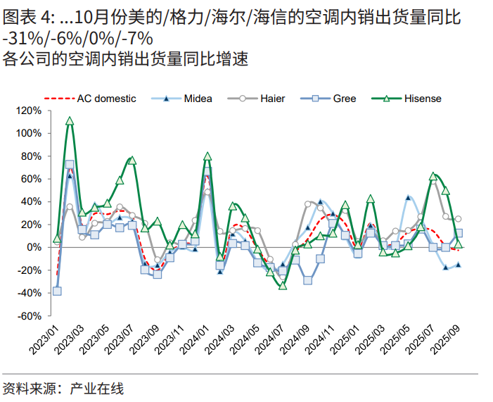 内销出货: 10月空调内销厂家出货量同比下降 21%,这一降幅大于此前排产计划预期的12% 。这也是自7月24日“以旧换新”政策宣布以来,零售额增速首次转负 。