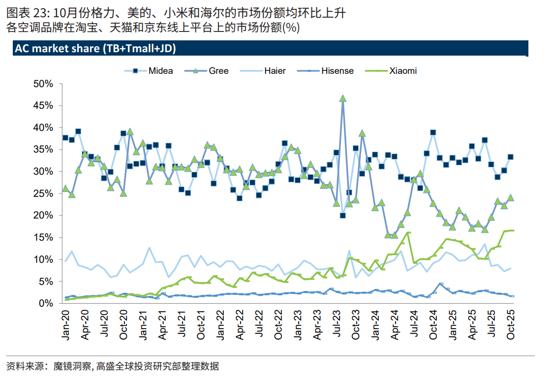 市场份额变化(线上): 在10月份的淘宝、天猫和京东平台上,格力、美的、小米和海尔的市场份额环比均有所上升 。