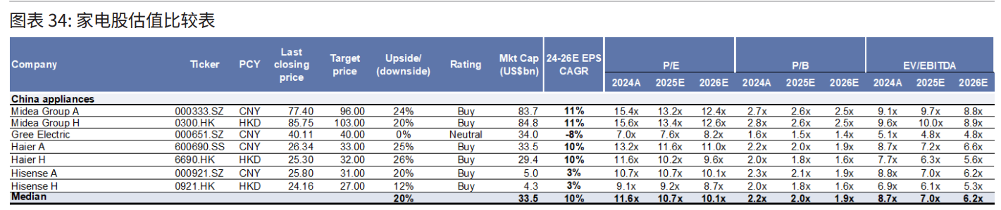 估值参考 (2025E P/E): 美的A股 12.4x,格力电器 8.2x,海尔智家A股 13.2x 。