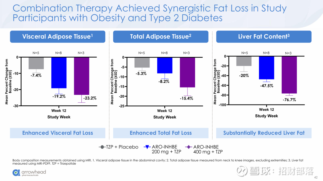 1)在肥胖2型糖尿病患者中,相较于单独使用替尔泊肽,ARO-INHBE与替尔泊肽联用时,16周数据实现体重减轻幅度翻倍,并使内脏脂肪、总脂肪和肝脏脂肪的12周内减少幅度提升3倍,并体现出良好耐受性。