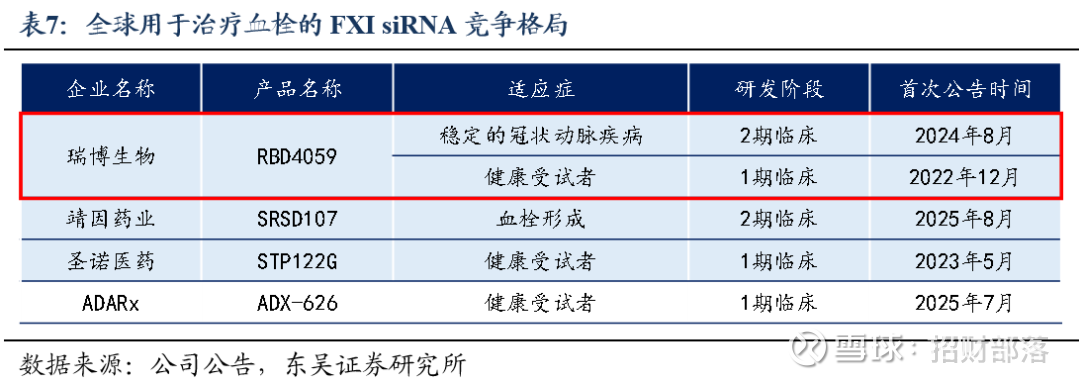核心产品RBD4059是全球首个进入临床的FXI siRNA。旨在长效抗栓且不显著增加出血风险,有望成为百亿美元级重磅药物。