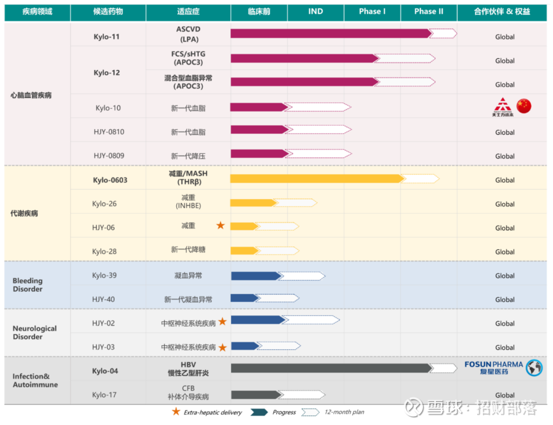 赫吉亚有4款产品进入临床阶段,拳头产品靶向Lp(a)的siRNA管线Kylo-11,是全球首个临床结果显示“一年一针”的BIC潜力产品,已在中美开展II期临床。临床前储备超过20个项目,包括减重(INHBE)、阿尔茨海默病(APP)等热门靶点。