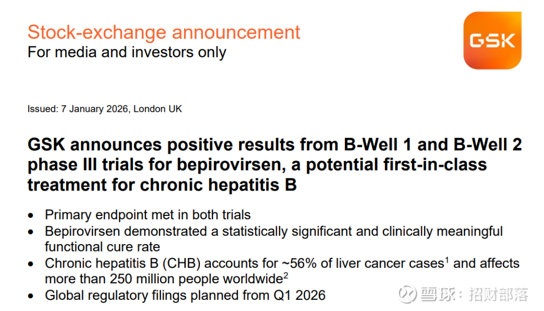 1月7日,GSK宣布其在研慢性乙型肝炎(CHB)治疗药物Bepirovirsen的两项关键III期临床试验B-Well 1与B-Well 2,均达到主要研究终点,成功验证了“有限疗程实现功能性治愈”的目标:1)成功达到主要终点:在超过1800名患者参与的试验中,bepirovirsen联合现有标准治疗,比单独使用标准治疗显著提高了功能性治愈率,且具有统计学和临床意义;