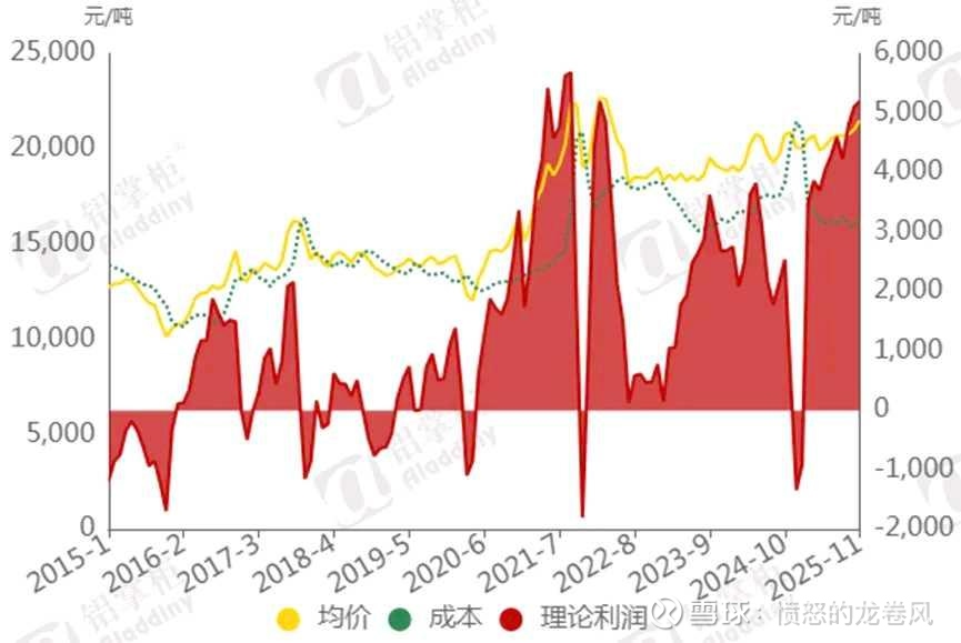 阿拉丁(ALD)成本盈亏模型测算结果显示,2025年11月全国电解铝加权平均完全成本16300元/吨左右,环比增加382元/吨(原料价格使用采购周期内均价,并非即期价格)。按照阿拉丁华东A00铝锭11月份结算价格21435元/吨测算,当月全行业平均利润超5100元/吨,再创年内新高。2025年1-11月份,全国电解铝行业算术平均成本约16742元/吨,较去年同期下降638元/吨,同比降幅3.67%;同期铝价为20586元/吨,同比上涨682元/吨或3.43%。2025年1-11月份,中国电解铝行业平均利润约3844元/吨,同比增加1320元/吨或5.23%。以年度周期为基准,2025年中国电解铝行业利润将刷新历史纪录,对比成本降幅和铝价涨幅来看,全年行业利润走扩的主要贡献来自铝价上涨。
