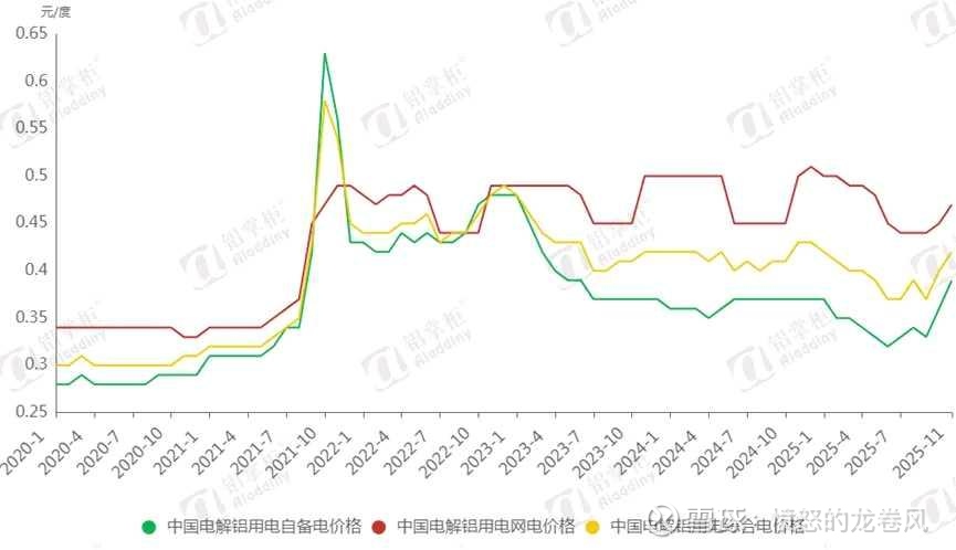 阿拉丁(ALD)成本模型测算结果显示,2025年11月,中国电解铝行业加权平均用电成本约为0.421元/千瓦时,环比上升0.024元/千瓦时,根本原因是进入采暖季后动力煤价格继续抬升,及云南等地进入枯水期,区域电价上涨。