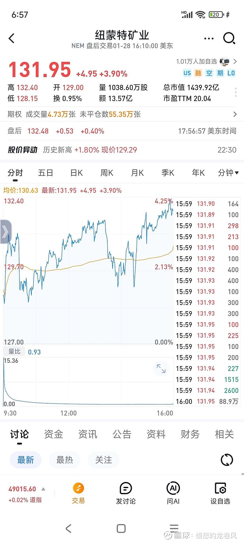 $纽蒙特矿业(NEM)$ 国际黄金巨头纽蒙特矿业目前大概20倍市盈率,紫金矿业收购联合黄金后,目前的1.1万亿市值就太低估了。维持目前金银铜锂价格,紫金矿业2026年应该是1000亿净利润左右,目前只有11倍市盈率。按照国际同类型矿业公司估值,紫金矿业就是到2万亿市值也不过分吧?$紫金矿业(SH601899)$
