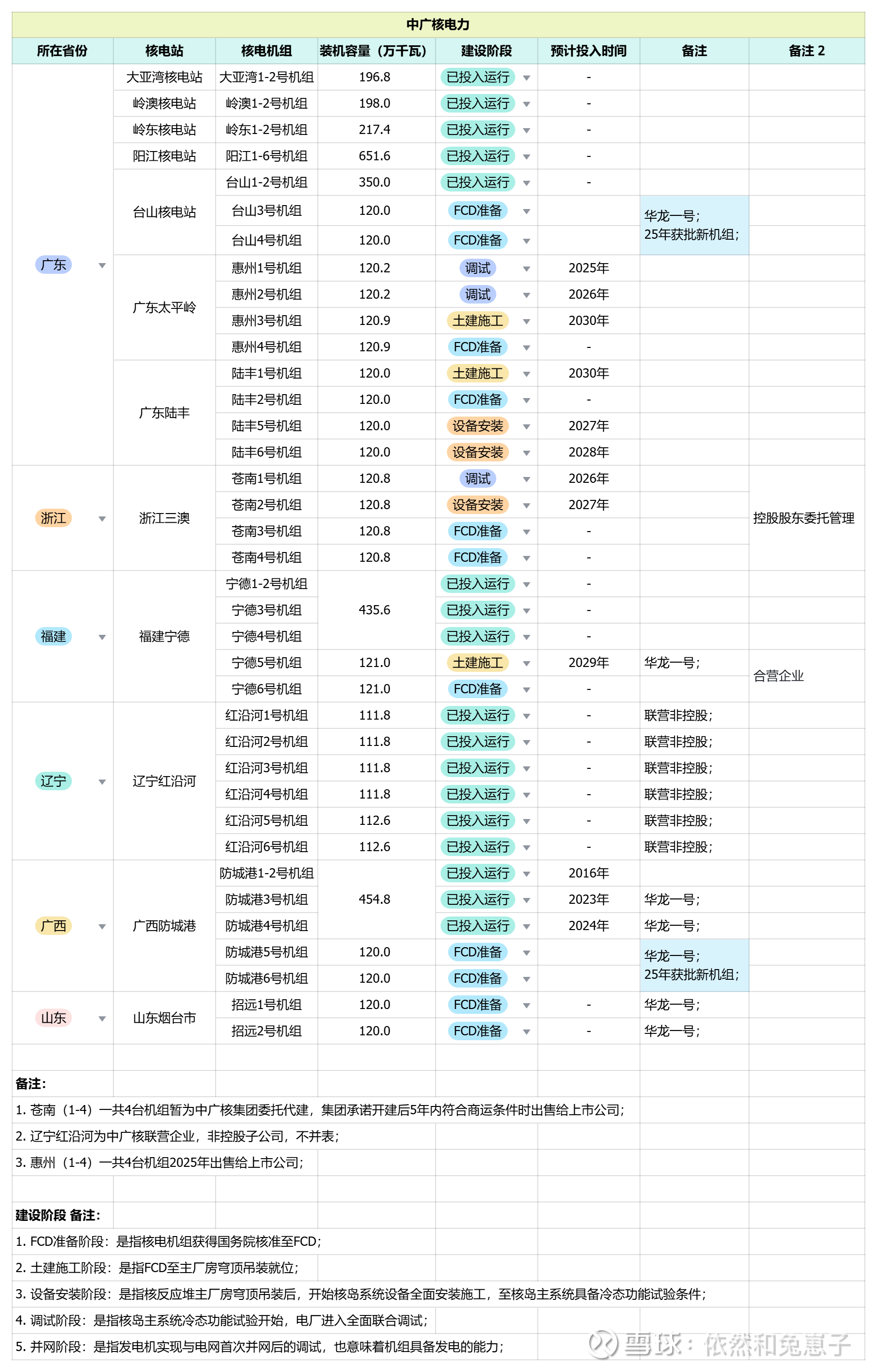 同时2025年,广核新确认核准了4台华龙一号,即台山3-4,城防港5-6机组;