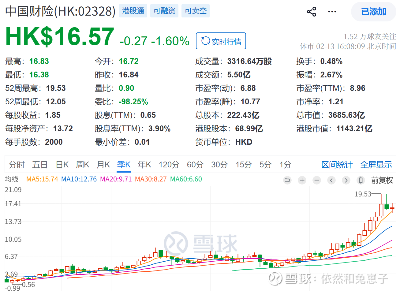 中国财险是国内财险绝对龙头,车险占比最高,业务简单易懂,没有寿险复杂的负债困扰,盈利更稳定。结合2026年2月最新数据,其当前PB约1.2倍,从我个人价值投资视角看,略高于内在价值。这一估值对比它自身的历史估值中枢并不合理,且已隐含部分盈利改善预期、兑现了增长红利。遵循巴菲特和芒格“安全边际优先”的理念,我建议等到1PB左右入手更合适,既能覆盖盈利波动风险,性价比也更高。好在它已纳入港股通,内地投资者可直接购买,长期来看是适合做底仓、赚复利的优质标的;