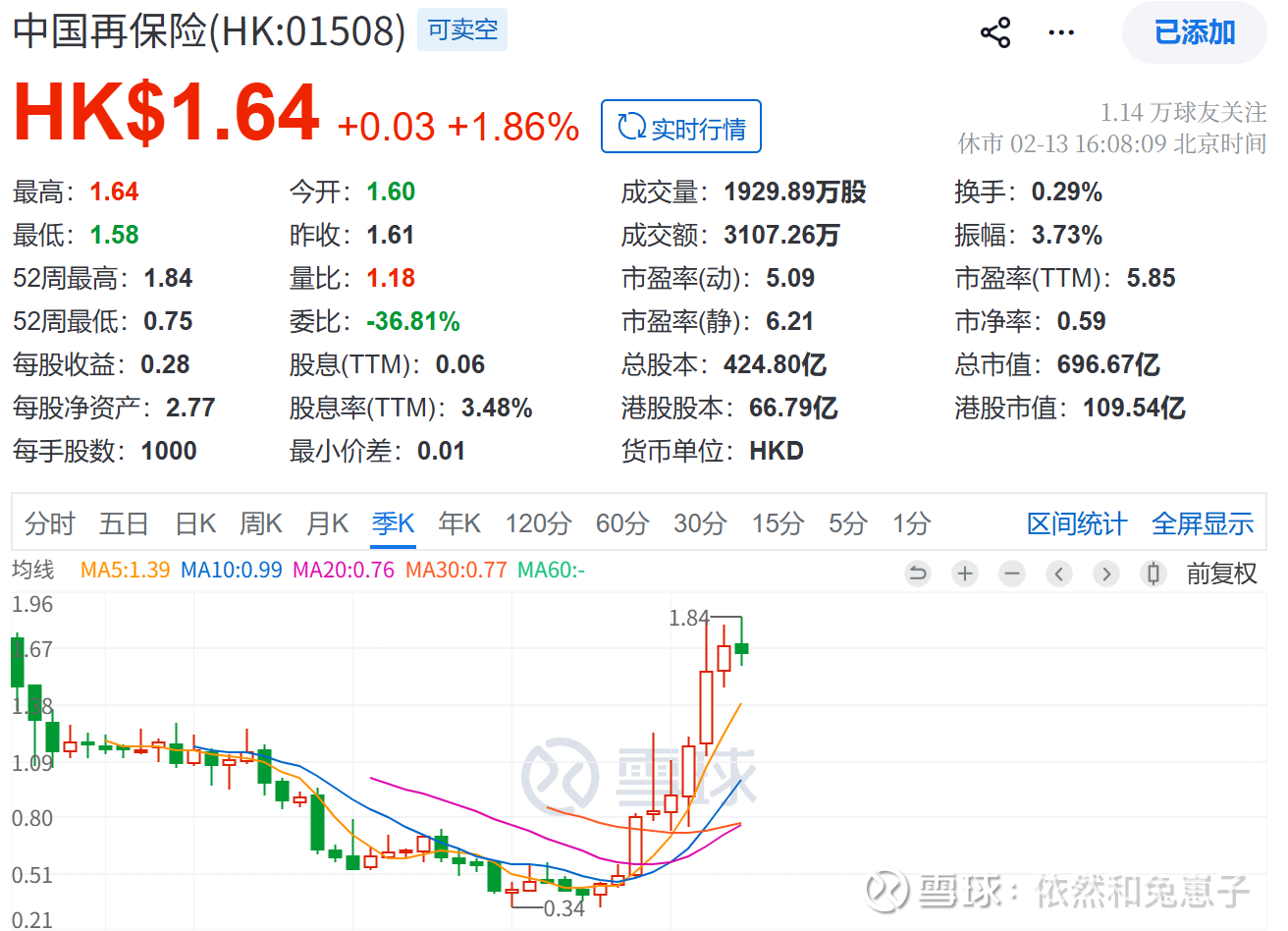 大家最关心的,中国再保险会不会进港股通?我查了下,港股通核心看市值和流动性,它现在总市值700多亿港元,远超50亿港元的最低门槛,流动性也达标,公司还在提升H股流通比例,增强流动性;