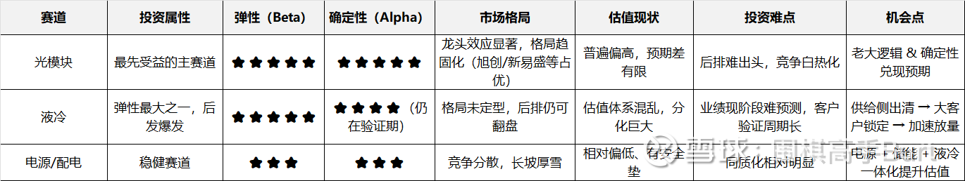 3)AI基建的各个组件的投资价值比较:液冷的开启顺序要晚于光模块,但弹性并不低于光模块