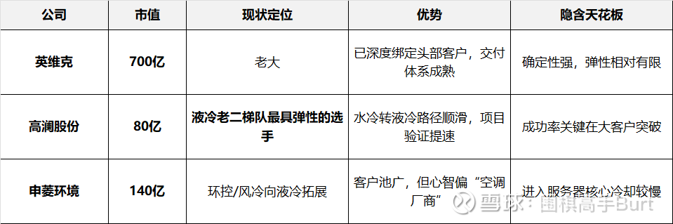 定位偏向液冷系统部件与模块供应商,在储能液冷与部分数据中心场景具备性价比优势。属于“第二供应商/备选供应商”角色:商业化速度快但天花板受限,更适合作为大客户供应链冗余的重要补充。