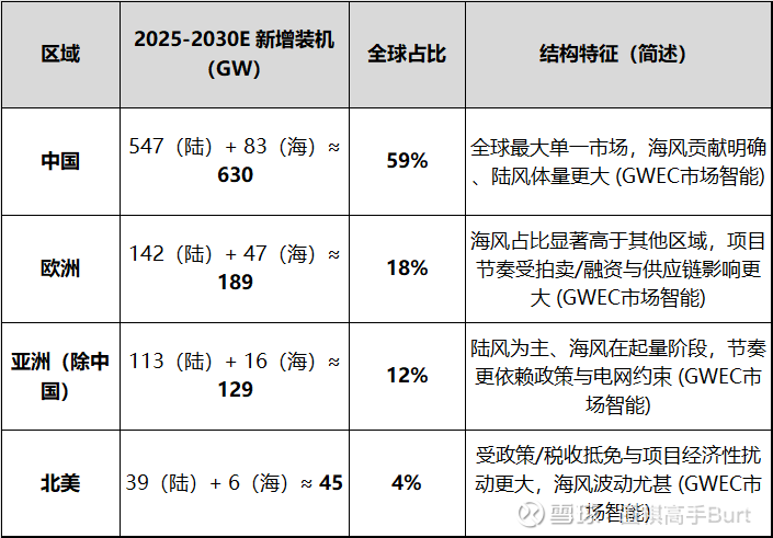 GWEC 对 2025-2030E 的全球新增风电给出 6.5% CAGR 的判断(总新增装机从 2024 年约 117GW 提升至 2030E 约 207GW),整体属于“稳增长”而非“爆发式”。