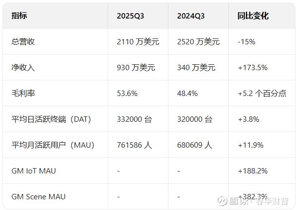 核心结论:2025 年第三季度优克联实现营收 2110 万美元、净利润 930 万美元,保持运营盈利;新业务(GM Life、GM IoT、GM Scene)用户规模同比激增,多款新产品落地;受宏观经济与贸易环境影响,下调 2025 年全年营收指引至 8130 万 - 8580 万美元,同时计划加速全球扩张与技术迭代。