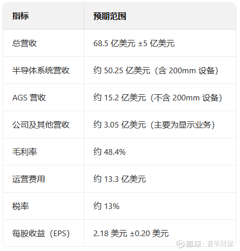 指标预期范围总营收68.5 亿美元 ±5 亿美元半导体系统营收约 50.25 亿美元(含 200mm 设备)AGS 营收约 15.2 亿美元(不含 200mm 设备)公司及其他营收约 3.05 亿美元(主要为显示业务)毛利率约 48.4%运营费用约 13.3 亿美元税率约 13%每股收益(EPS)2.18 美元 ±0.20 美元