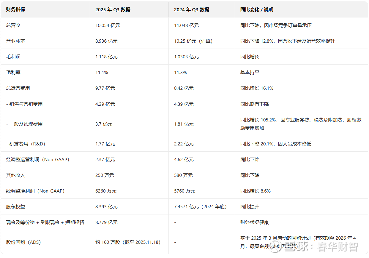 2025 年第三季度,面对外部挑战,Flash X 持续强化 “按需专属配送”(on-demand dedicated courier)核心模式,通过提升服务质量、优化用户体验、拓展服务品类与场景、测试新技术、升级派单算法(dispatch algorithms),聚焦高价值、时效敏感领域,扩大商户与个人用户覆盖,为长期可持续增长奠定基础。核心业绩数据:2025 年第三季度总营收 10.054 亿元人民币,毛利率 11%;经调整净利润 6260 万元人民币,同比增长 9%;截至季度末,现金及现金等价物、受限现金与短期投资合计 8.779 亿元人民币,财务状况健康。