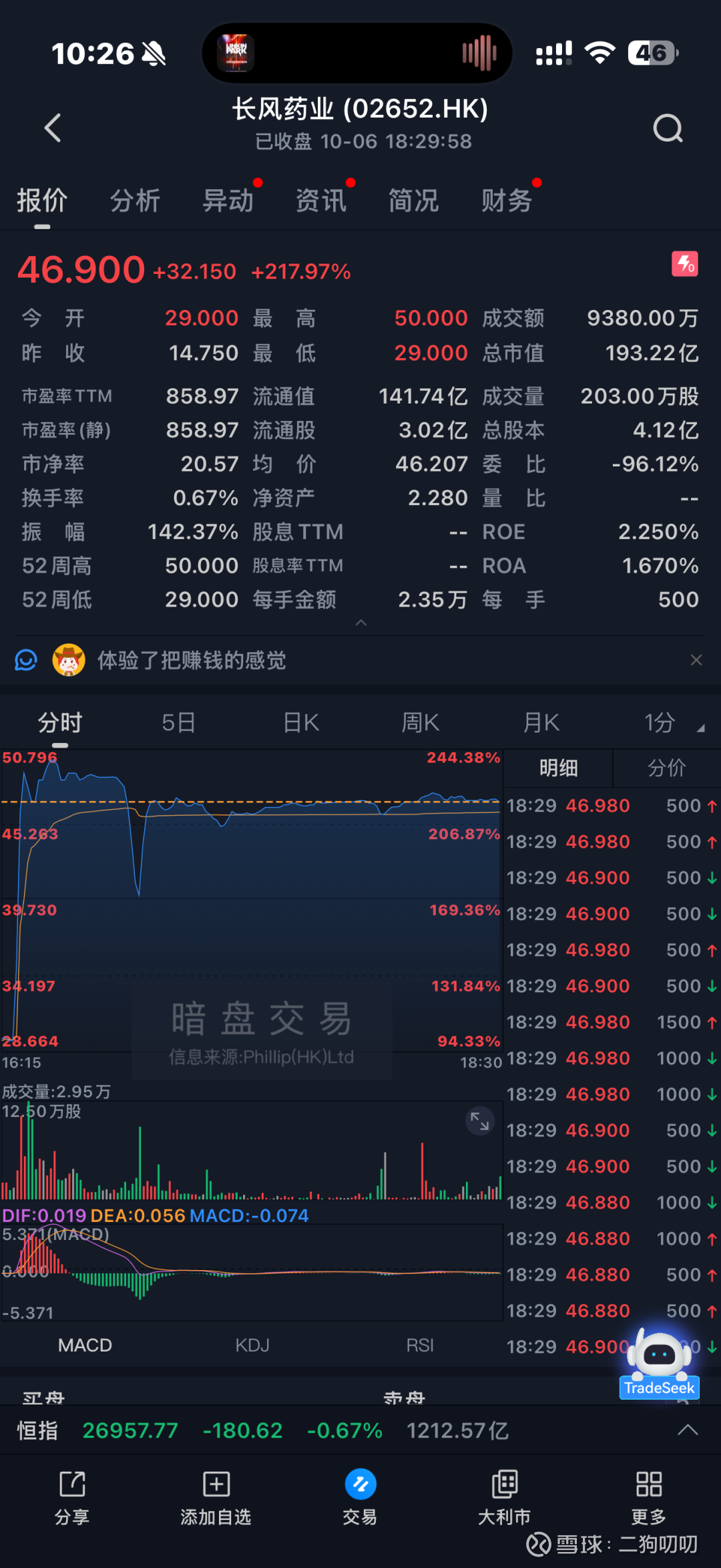 看到长风药业这暴涨的节奏,也是真的激动,搞的二狗哥的肾上腺素飙升,暗盘42港元的时候搞了点,不过拿着也不是很舒服,尾盘46就出了,做做差价,也算是把融资的手续费搞了回来。。。