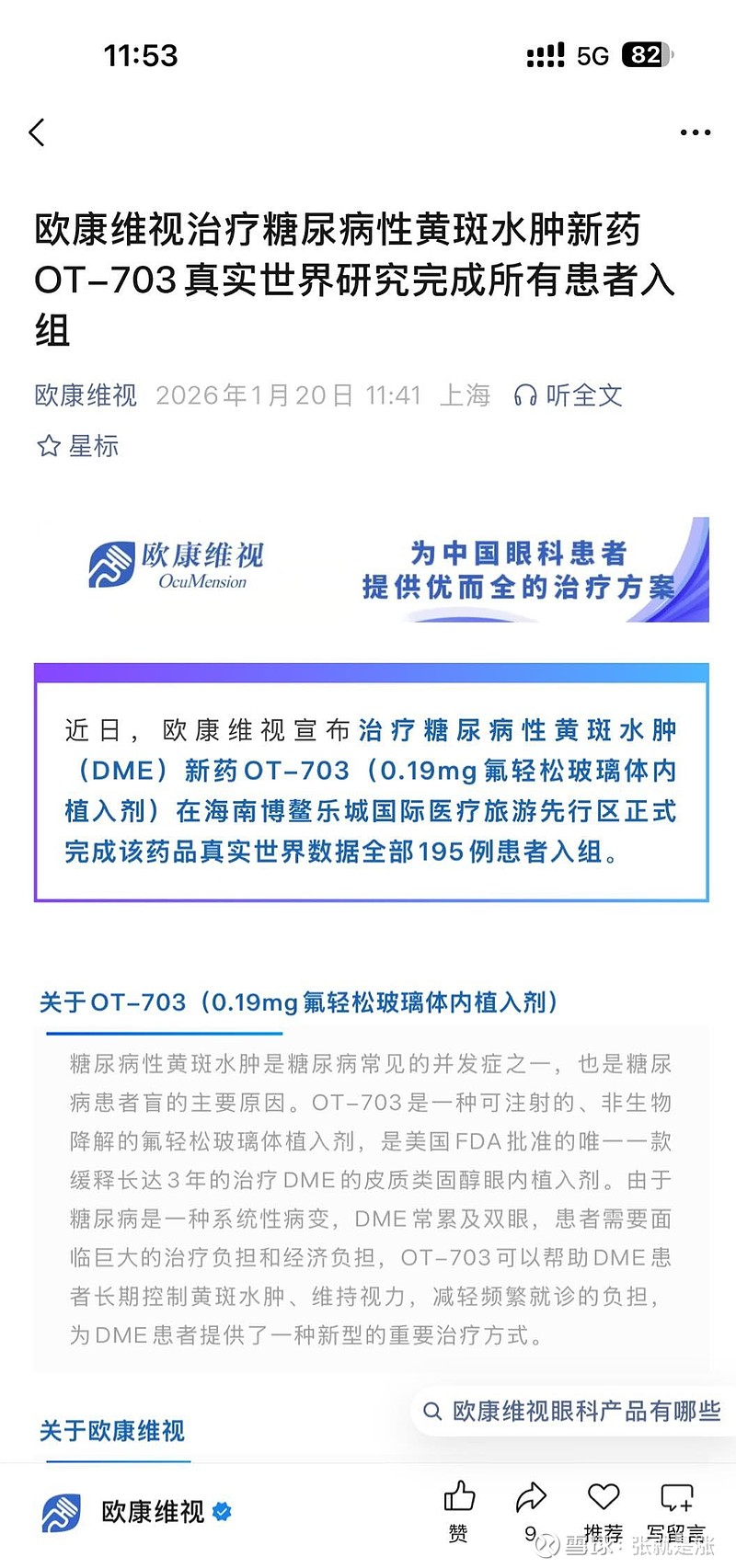 欧康维视治疗糖尿病性黄斑水肿新药OT-703真实世界研究完成所有患者入组